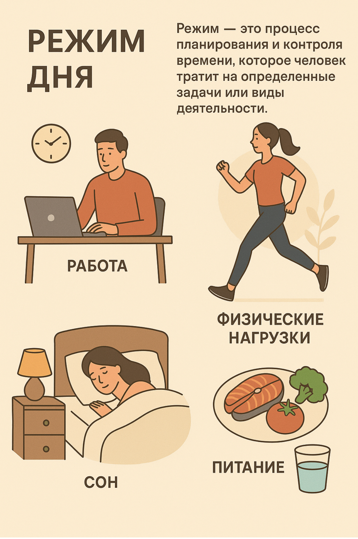 Режим — это процесс планирования и контроля времени, которое человек тратит на определенные задачи или виды деятельности. Режим дня играет ключевую роль в нашей жизни, помогая нам быть более продуктивными и здоровыми. Правильная организация времени позволяет избежать стресса, улучшить качество сна и повысить общую эффективность. Режим дня позволяет наилучшим образом использовать ресурсы организма и правильно распределить имеющееся время.