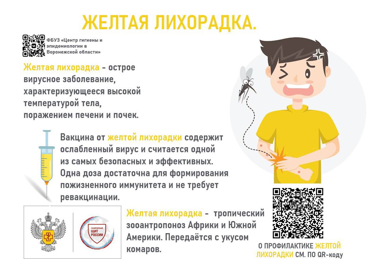 На сайте ФБУЗ «Центр гигиены и эпидемиологии в Воронежской области» в разделе «Полезная информация» размещены информационные материалы по желтой лихорадке и медицинским организациям, где можно от нее привиться, лихорадке Денге, лихорадке Западного Нила.