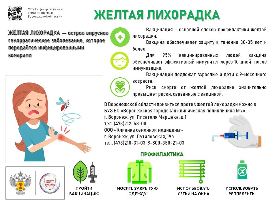 На территории Воронежской области вакцинацию против желтой лихорадки осуществляет БУЗ ВО «Воронежская городская клиническая поликлиника №7», г. Воронеж, ул. Писателя Маршака, д.1, тел: (473)212-58-00, эл. почта: mail@gkp7.zdrav36.ru