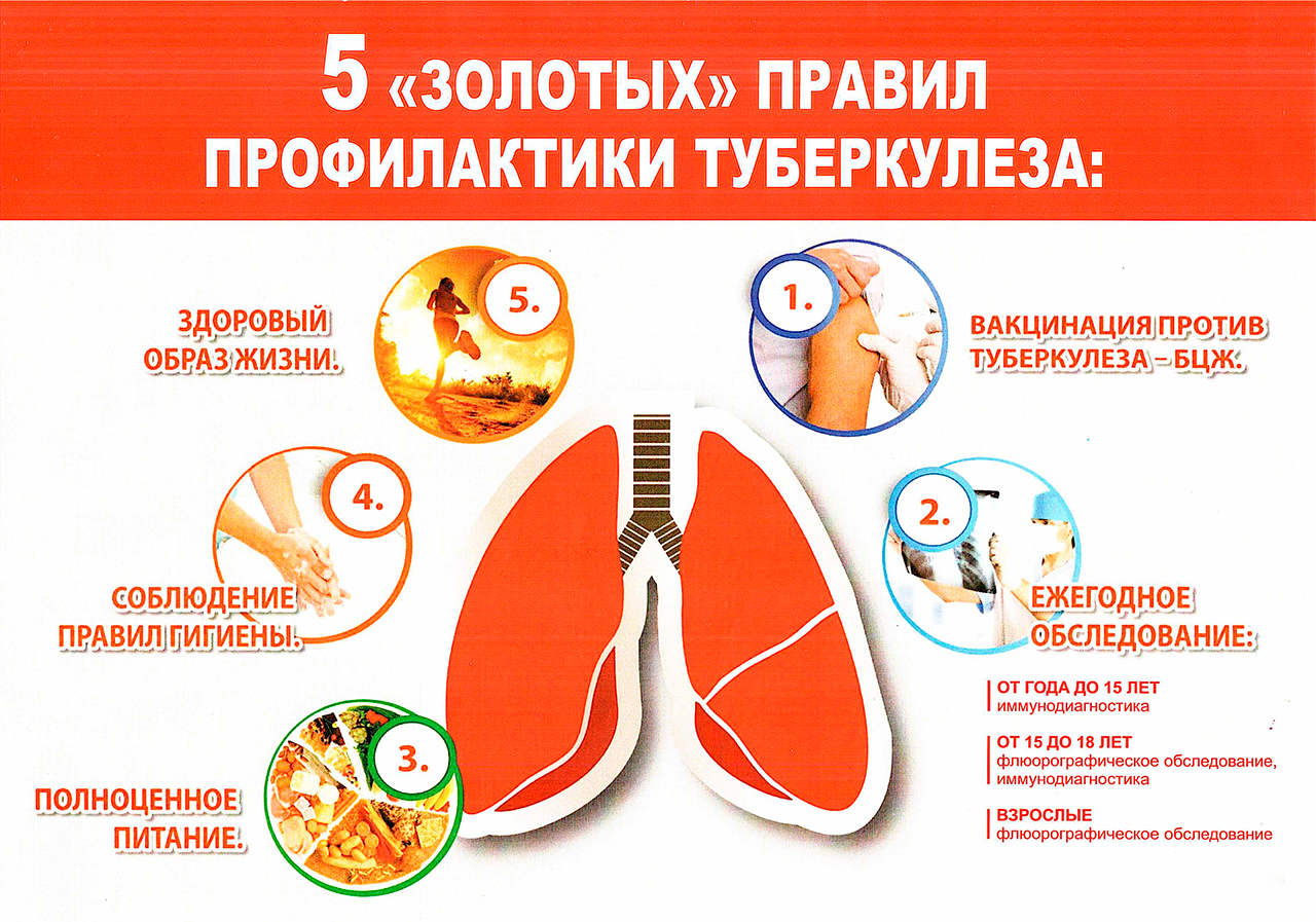 2. Проведение ежегодной туберкулинодиагностики детям до 18 лет (проба Манту, Диаскин тест) для ранней диагностики туберкулеза (группы риска — 2 раза в год); 3. Для взрослых и детей старше 15 лет прохождение профилактического медицинского (флюорографического) осмотра для своевременного выявления туберкулеза (группы риска — 1 раз или 2 раза в год).
