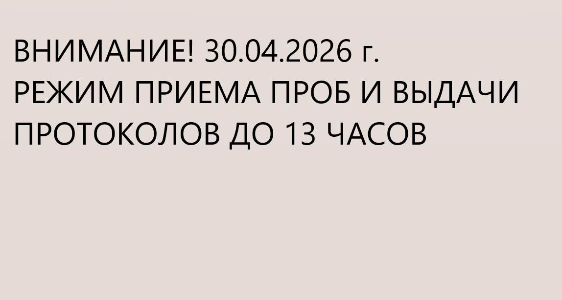 ФБУЗ «Центр гигиены и эпидемиологии в Воронежской области» сообщает, что 30 апреля 2026 г. , согласно Трудовому кодексу РФ предпраздничный сокращенный день. В связи с этим, режим приема проб и выдачи протоколов испытаний по внебюджетной деятельности будет осуществляться до 13.00.